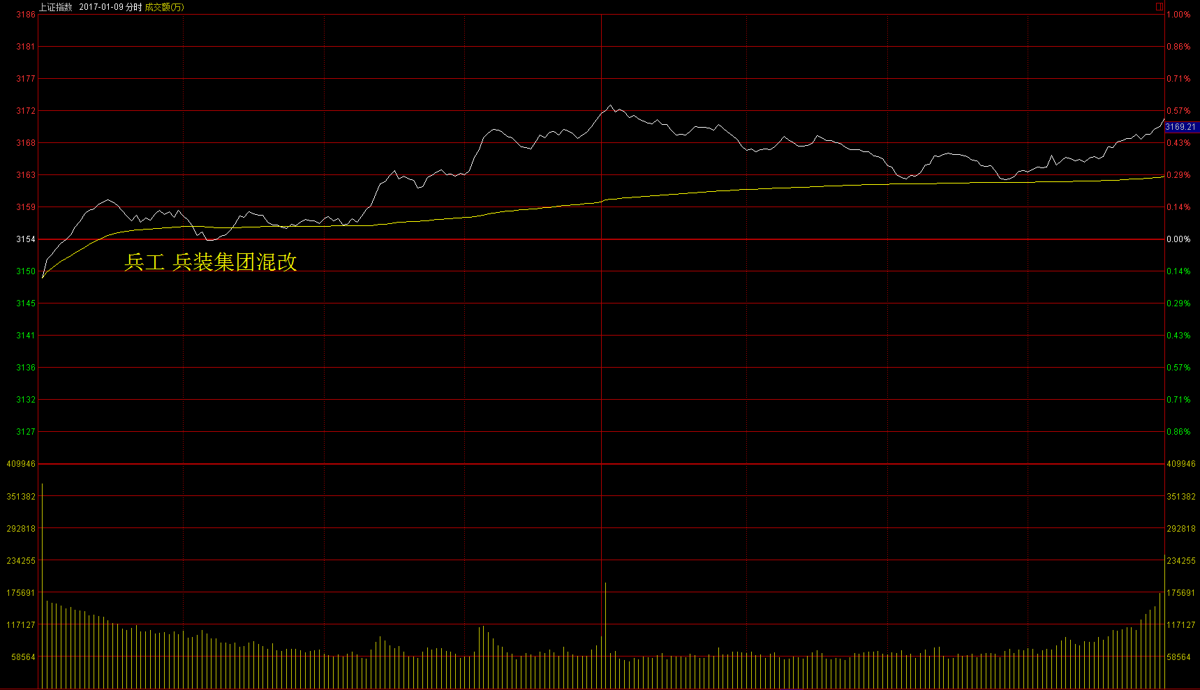 1月9日周一两市低开后沪指震荡上行,创业板弱势震荡,分化严重。早盘兵工和兵装集团混改表现抢眼,午后市场热点较少。收盘沪指上涨0.54%,创业板下跌0.17%。国资混改概念主要炒作兵工集团和兵装集团,北化股份(002245)放量三板,湖南天雁(600698)5天4板,炒作气氛热烈,带动长春一东(600148)、西仪股份(002265)2板,板块内打板个股还有光电股份(600184)、北方导航(600435)、东安动力(600178)、利达光电(002189)。此外电改概念的甘肃电投(000791)、红相电力(300427),山西国改的太钢不锈(000825)涨停。