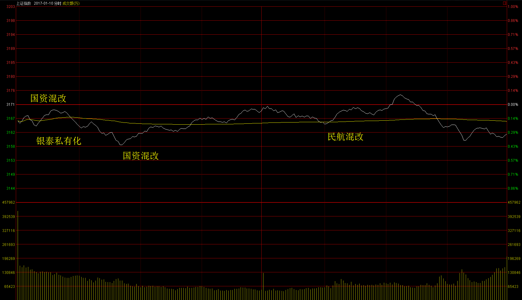 1月10日周二两市低开后弱势震荡,小幅下跌。早盘军工混改分化,地方国改、重组股、前期庄股、零售股活跃,午后民航、有色、庄股活跃。收盘沪指下跌0.3%,创业板下跌0.51%。兵工集团和兵装集团混改今日大幅分化,地方国改活跃,但个股众多,延续性不好。新疆国改的西部建设(002302)、云南国改的云南城投(600239)、湖南国改的湖南发展(000722)涨停。早盘阿里巴巴启动银泰私有化,百大集团(600865)、杭州解百(600814)涨停。