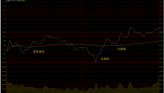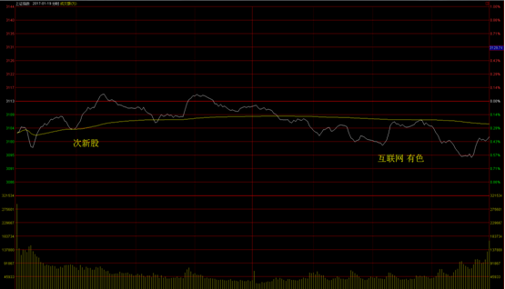 1月17日周二两市低开下跌后走出V型上涨走势。早盘庄股,LED,次新股,混改活跃,午后创业板互联网个股超跌反弹,次新股爆发。收盘沪指上涨0.17%,创业板上涨2.02%。次新股今日大爆发,带动市场情绪回暖,龙头皖天然气(603689)2连板,午后以互联网为代表的创业板权重迅速拉起,带动指数走出V型走势,任子行(300311)、金盾股份(300411)、聚飞光电(300303)见板。庄股今日集体表现,龙头新亚制程(002388)4天3板,其他利君股份(002651)、奇正藏药(002287)等均打板。今日也有大量前期涨停回落反包票,在市场情绪转折时也代表了市场回暖。