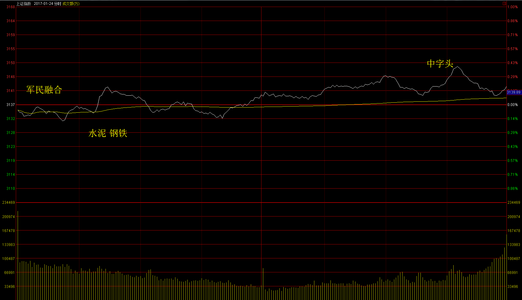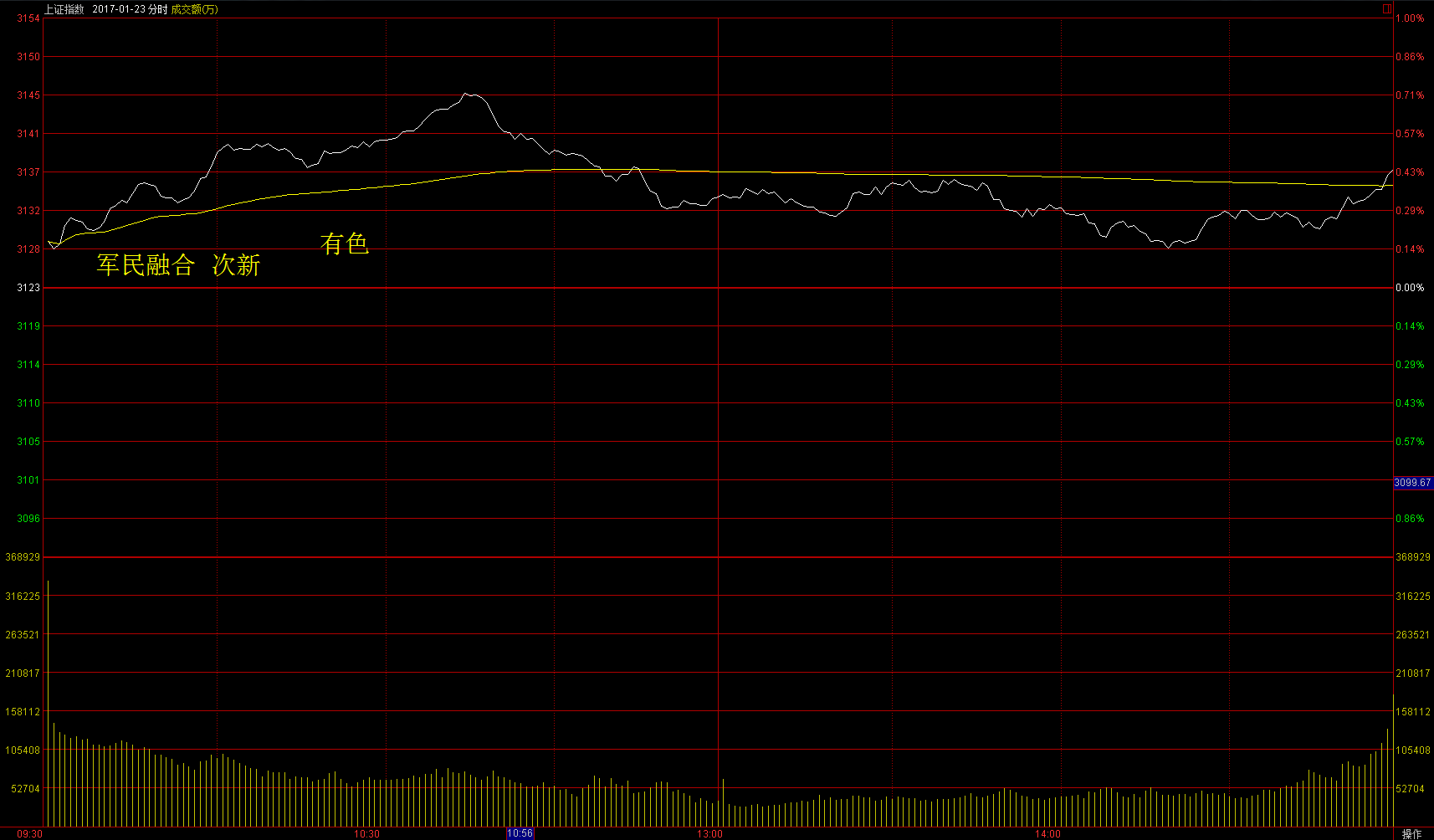 1月23日周一两市高开后震荡上行,午后有所回落。早盘军民融合概念大涨,庄股、次新股、超跌反弹、有色活跃,午后市场无热点,指数震荡回落。收盘沪指上涨0.44%,创业板上涨0.35%。受周末军民融合发展委员会成立消息刺激,早盘军民融合概念4只个股一字开盘,板块多只个股拉升,龙头菲利华(300395)。
