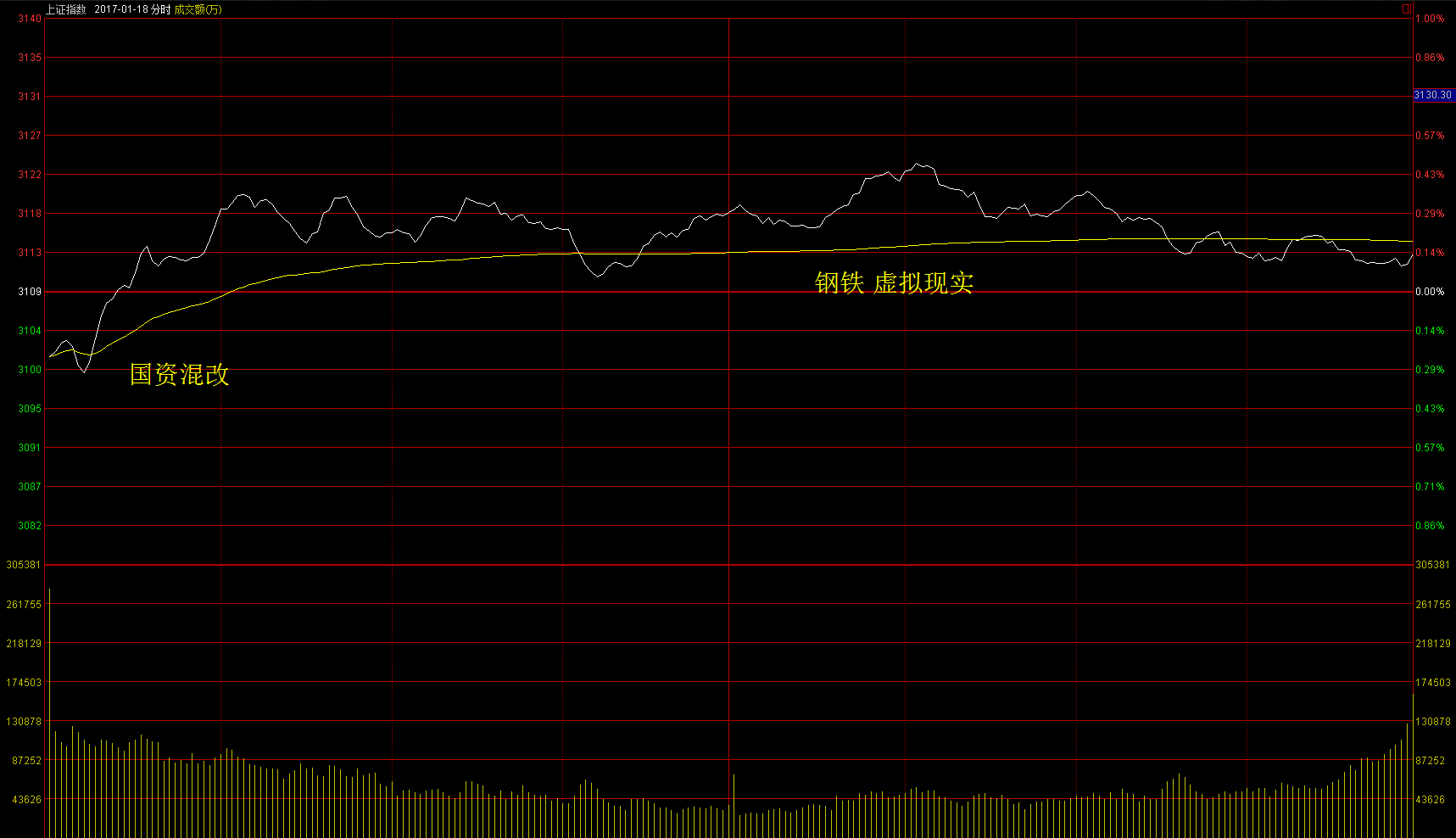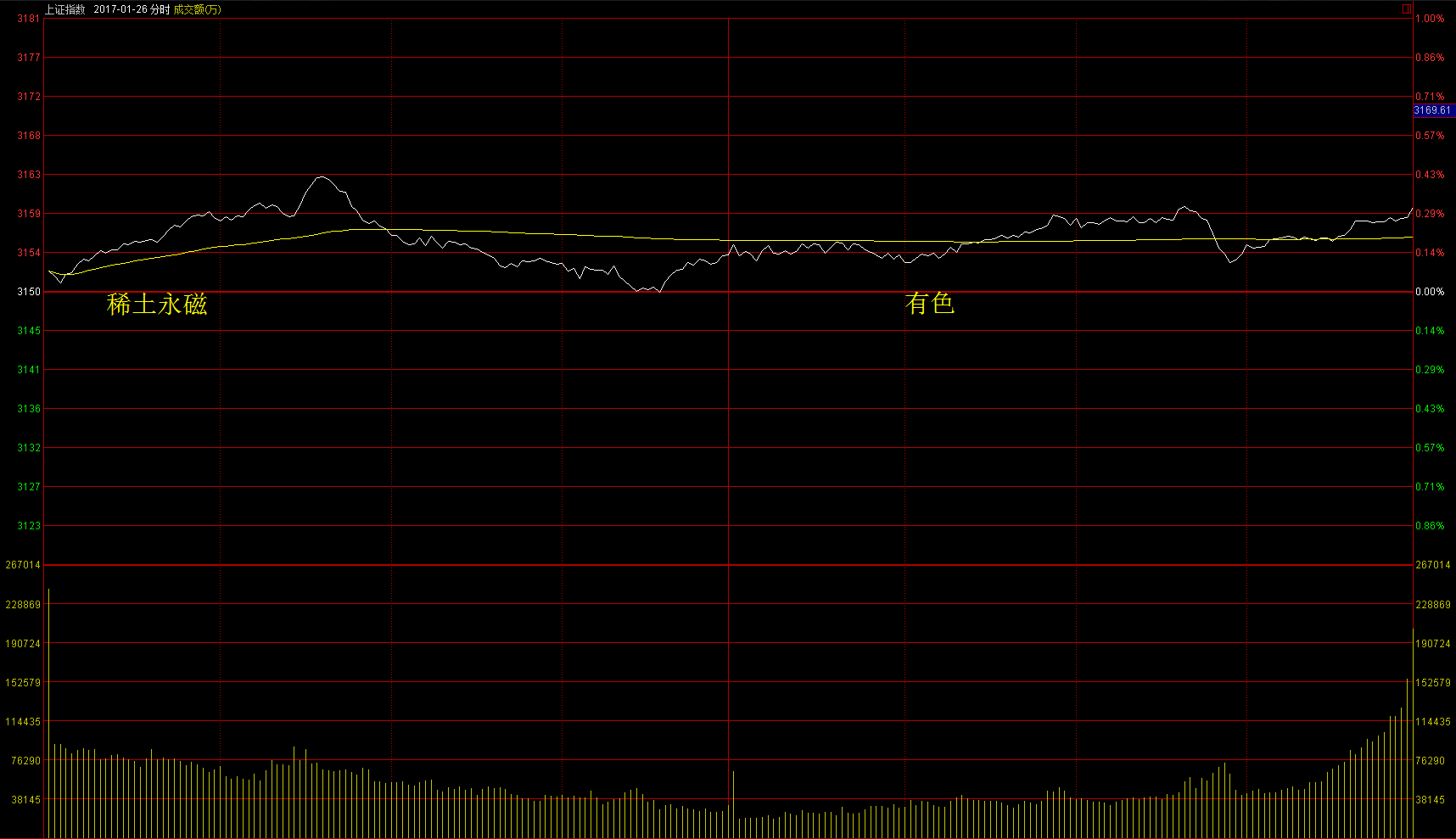 1月26日周四两市平开后震荡上行,创业板较强。早盘稀土永磁、庄股、军民融合概念活跃,午后次新股、有色、涨幅居前。收盘沪指上涨0.31%,创业板上涨0.83%。今日有色股活跃,早盘稀土永磁和午后的铜涨幅居前,稀土叠加了超跌反弹属性,铜类个股趋势较好,龙头云南铜业(000878)。