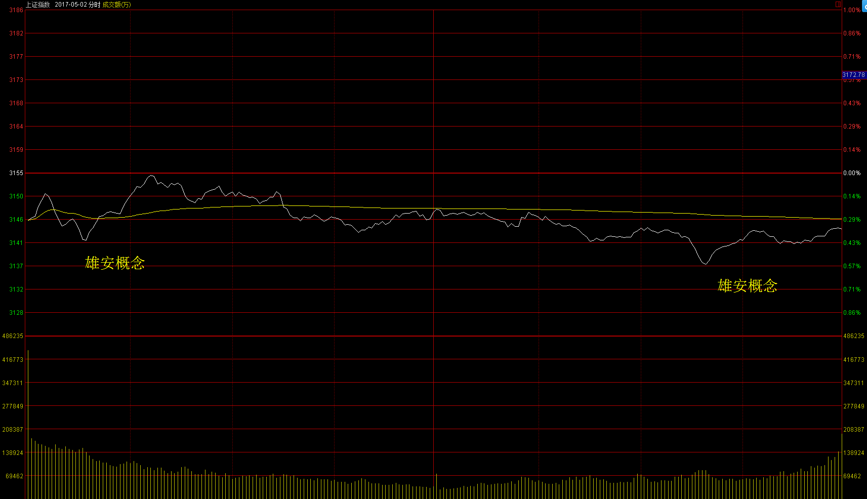 5月2日周二低开后弱势横盘整理。早盘雄安概念依旧强势,超跌反弹个股活跃,午后雄安概念继续大涨,跟风个股涨停不断。收盘沪指下跌0.35%,创业板上涨0.01%。雄安板块汉钟精机快速缩量三板日内龙头,核心股冀东装备6天5板缩量涨停,石家庄新区、数据库建设等消息刺激不断。大盘有企稳后上行反弹迹象。