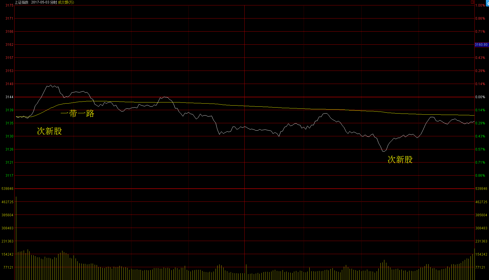 5月3日周三两市低开后震荡下行。雄安概念跌幅较大,早盘次新股、一带一路、填权、军工等个股集体活跃,午后次新股和地方国改活跃。收盘沪指下跌0.27%,创业板下跌0.56%。早盘坤彩科技开盘秒板,吸引雄安板块资金流出,次新股全天表现强势,尾盘一些超跌次新股反弹。新宏泽作为填权和次新股双概念5天4板,超跌填权个股也开始跟风。