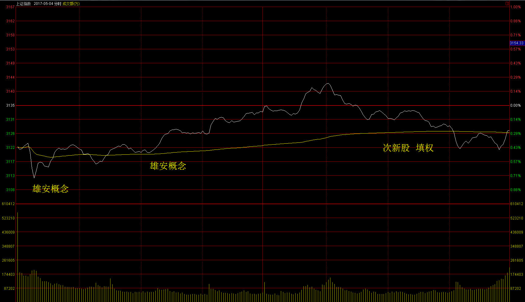 5月4日周四两市低开后探底回升,午后大幅回落。早盘雄安概念大幅上涨,地下管网分支最强,午后雄安跟风股快速跳水,次新股,填权开始活跃。收盘沪指下跌0.25%,创业板下跌0.13%。雄安概念早盘大幅上涨,地下管网分支受刺激,韩建河山作为日内龙头早盘急速缩量板点燃市场热情。午后跟风股开始大幅回落,冀东装备杀跌幅度较大,板块大分化。次新股今日午后在雄安概念快速回落之际再次拉升,与雄安概念形成明显的跷跷板效应。