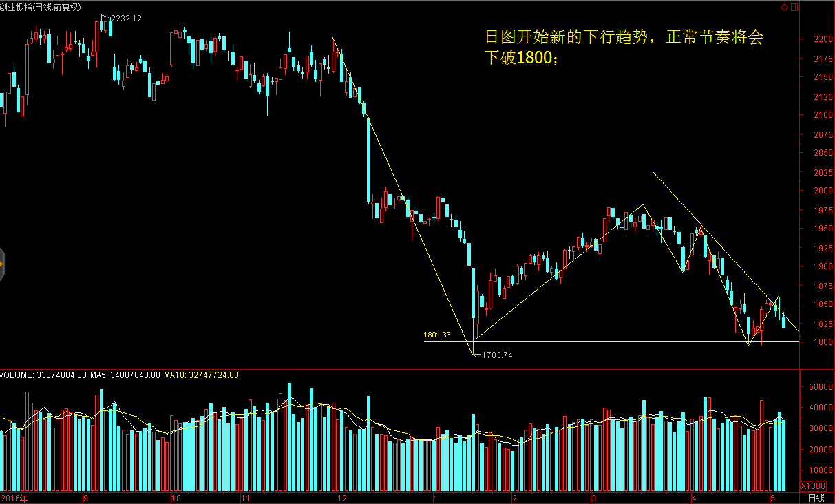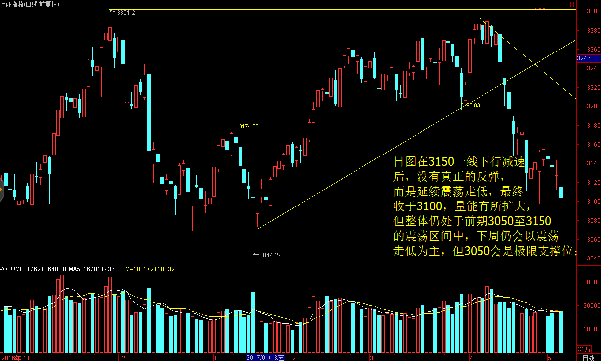 5月第一周预想的反弹没有到来,而是继续阴跌。市场氛围没有明显改善,资金面仍旧趋紧,监管层没有新的松口迹象,都使市场反弹谨慎。但下行空间也不大,3100处也有明显的托市效应,仍会在市场情绪具备的时候进行反弹。随着一带一路高峰会议的临近,相关概念热点高涨,反弹仍是可期的。