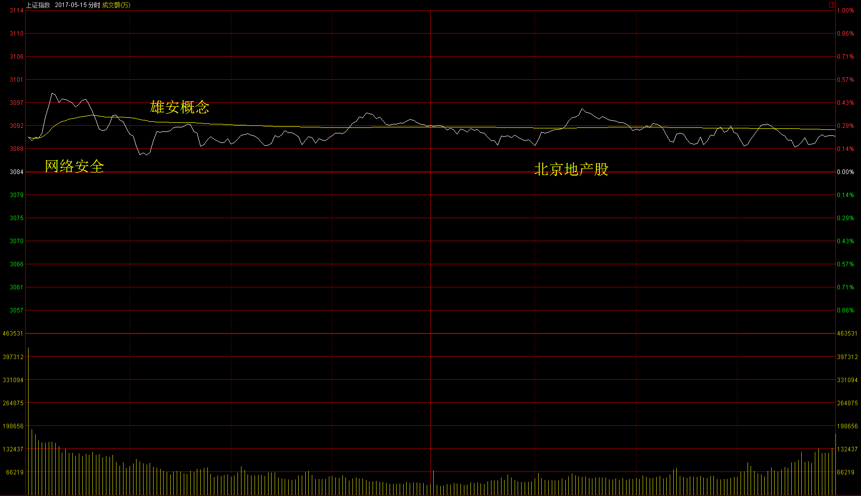 5月15日周一两市高开后横盘震荡。早盘网络安全概念集体一字,雄安概念继续活跃,午后北京地产股、次新股、高送转概念活跃。收盘沪指上涨0.22%,创业板上涨0.23%。周末勒索病毒消息刺激网络安全整体爆发,但基本处于超跌反弹,持续性较弱。早盘博深工具快速缩量3板奠定雄安龙头,资金基本都在雄安概念中。中央政务区概念午后发酵,京能置业带动北京本地地产股大幅拉升。指数上延续缩量反弹,整体仍属谨慎回调。