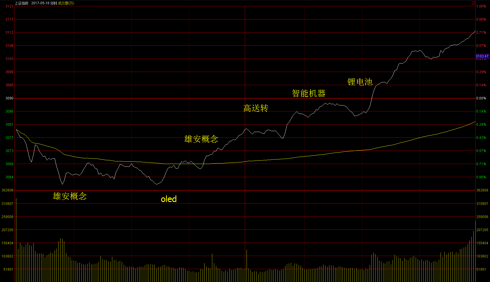 5月16日周二低开后下杀,然后单边上行,创业板大涨。早盘雄安、高送转、oled活跃,午后高送转、智能机器、锂电池、雄安集体拉升,指数大涨。收盘沪指上涨0.74%,创业板上涨2.04%。今日雄安概念低位个股集体拉升,装配式建筑龙头太空板业一字开盘,津膜科技换手后继续封板,环保分支依旧强势。高送转个股集体活跃,填权和抢权类个股更为强势。盘面上回调到位,势必会有所回落,需要关注。