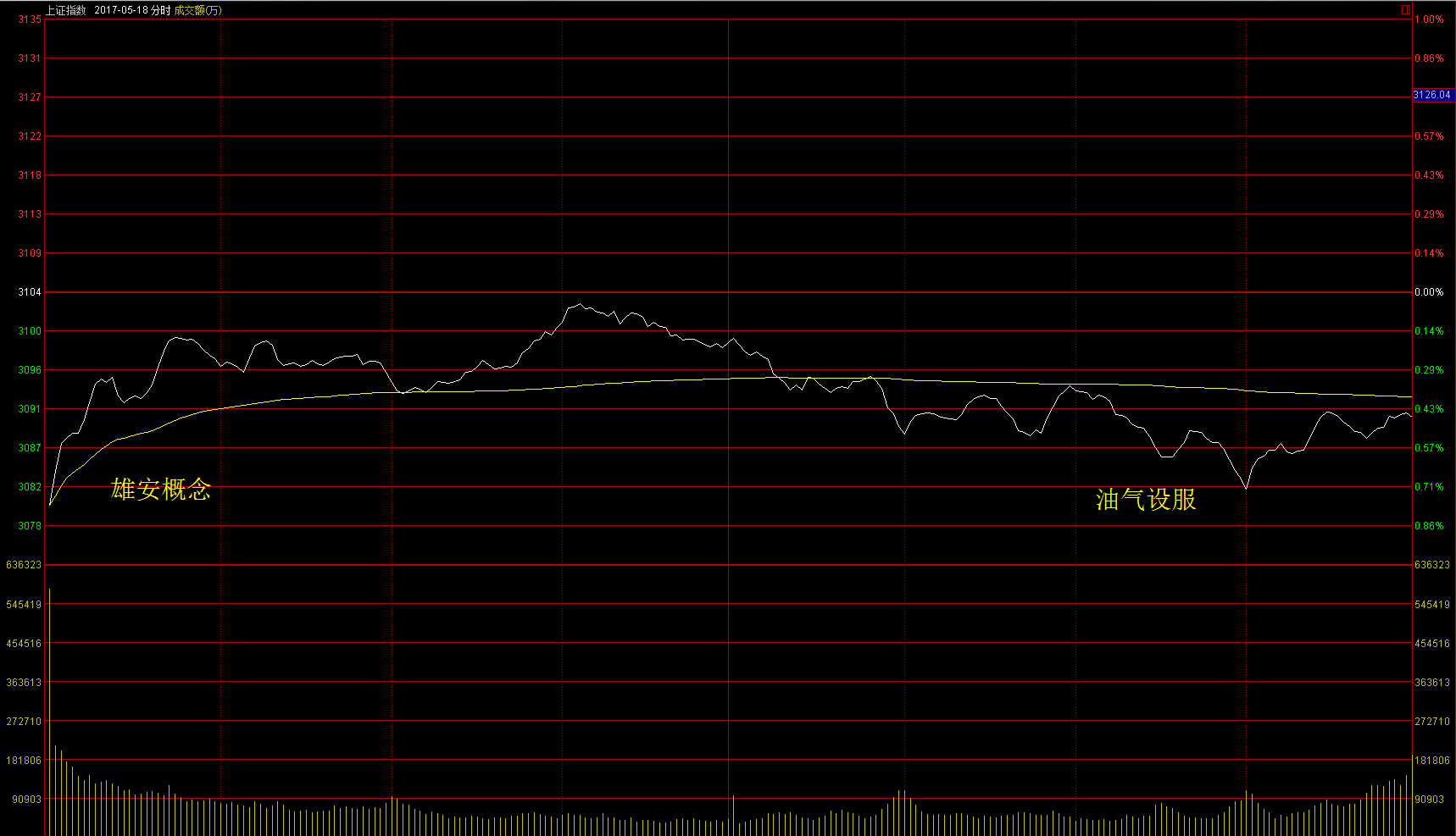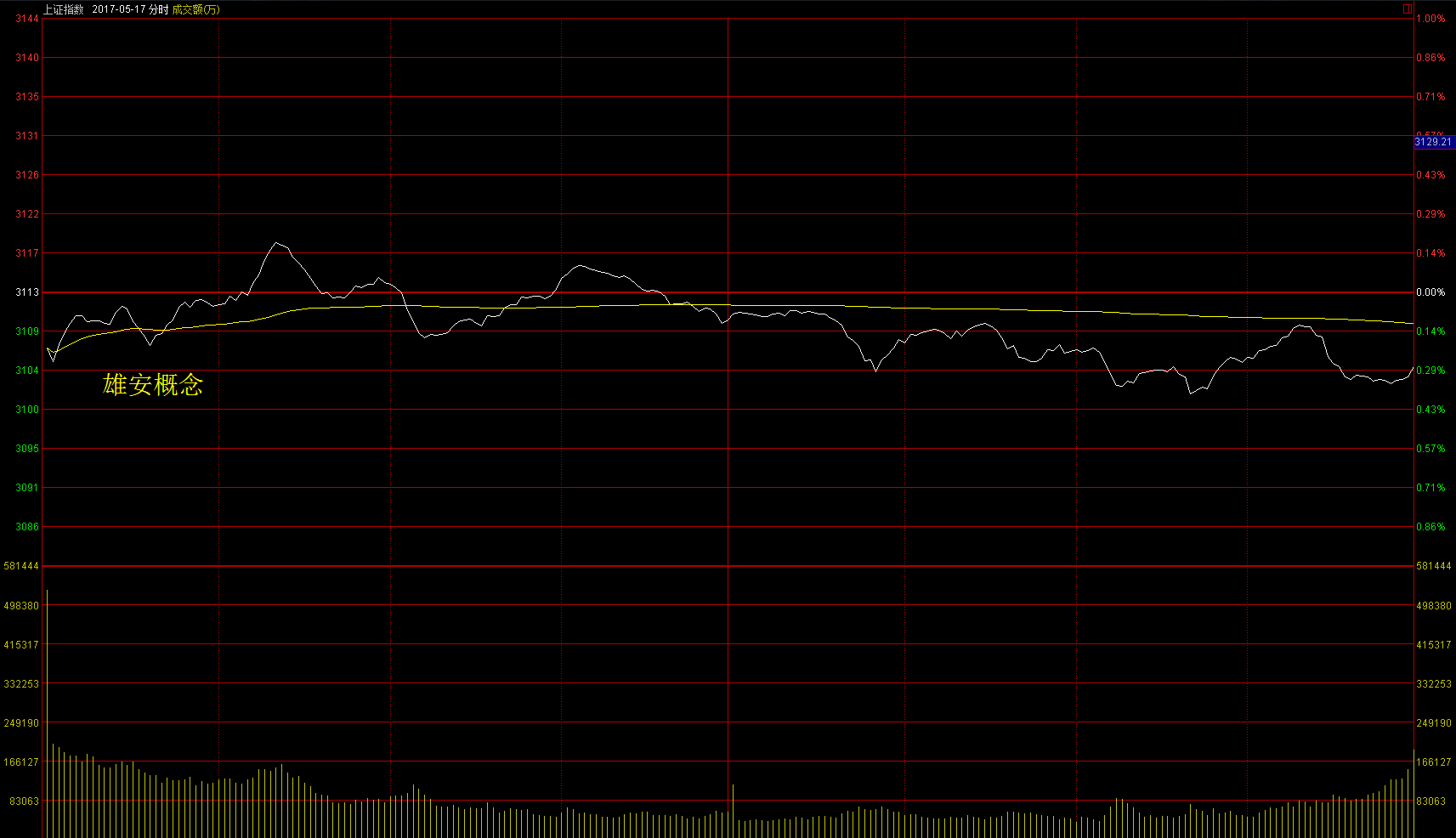 5月17日周三低开后横盘整理,尾盘小幅回落。早盘雄安、高送转大涨,超跌反弹股、网络金融活跃,午后雄安概念大幅分化。收盘沪指下跌0.27%,创业板上涨0.42%.雄安板块依旧强势,受刺激的地位个股快速补涨,龙头股集体一字开盘,随后板块开始分化。题材只剩下雄安,其他都属于脉冲式,基本没有参与价值。指数冲高后需要新的强势板块出现才能有新的行情,目前来看很难出现。