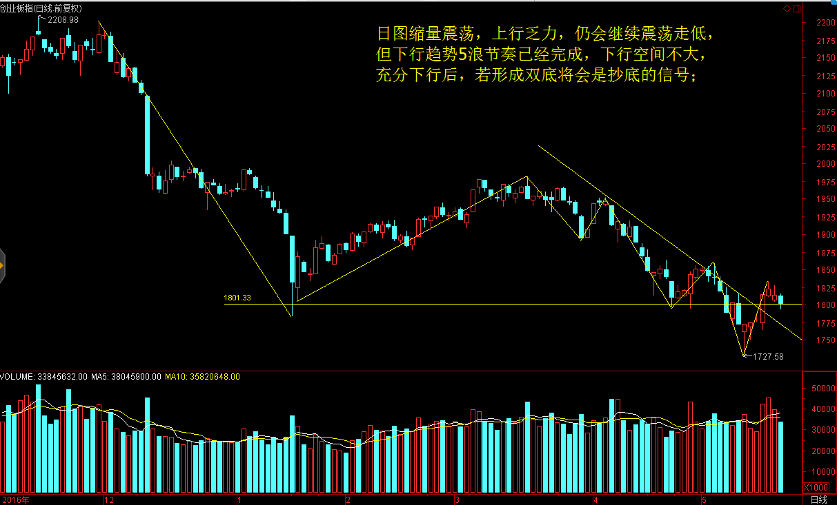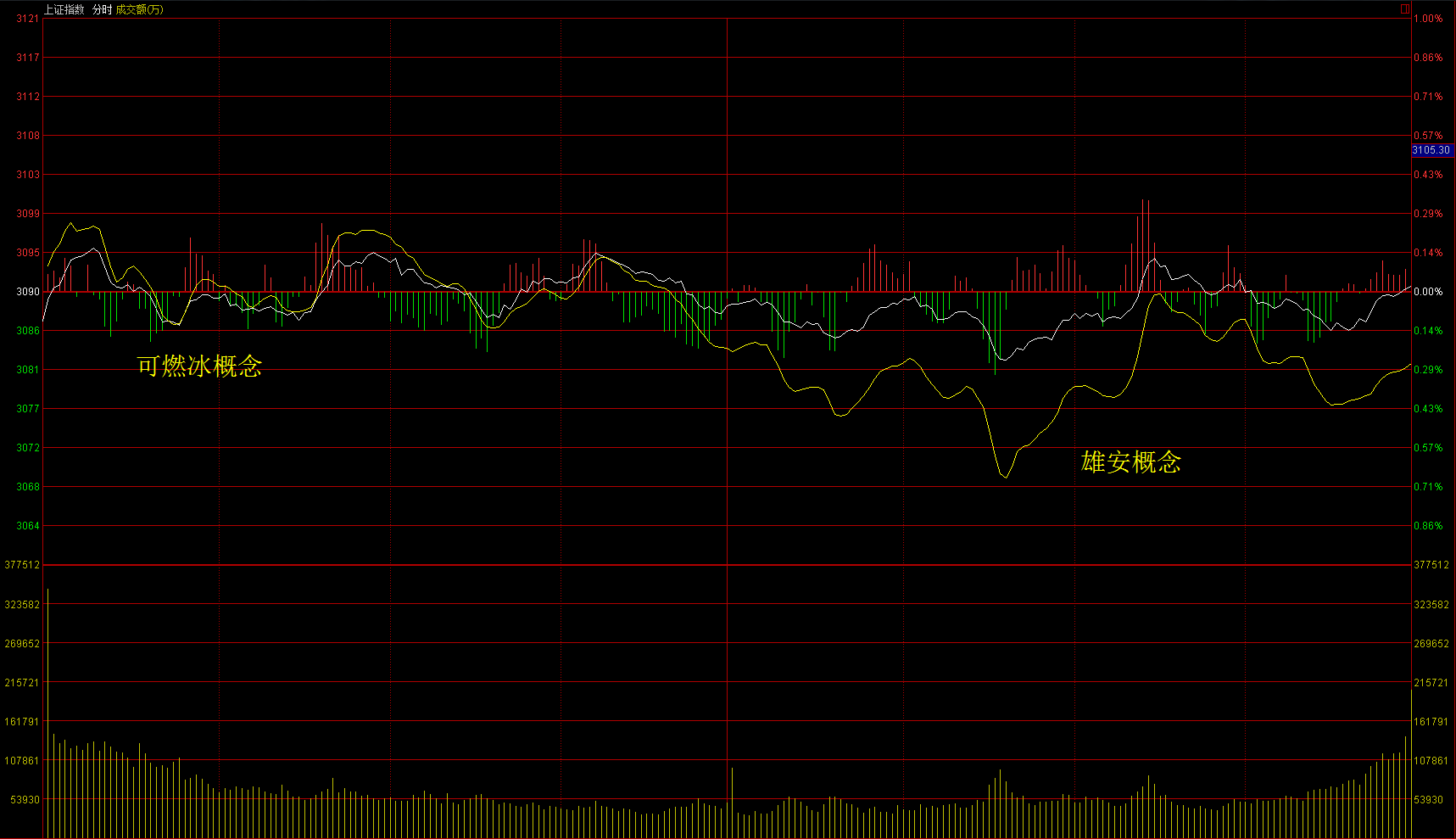 5月19日周五两市低开后沪指弱势横盘,创业板单边下行。早盘可燃冰概念大涨,雄安调整,午后雄安股再次拉升,软件股活跃。收盘沪指上涨0.02%,创业板下跌0.69%。雄安概念早盘继续调整,多数反弹个股是受大股东参与雄安消息刺激的低位补涨股。可燃冰概念早盘潜能恒信一字开盘,石化机械高卡秒板,但盘整分化严重,尾盘再次开板。指数上基本没有方向性,但更高级别下行趋势依旧,再次下行的概率更高,需要注意下杀风险。