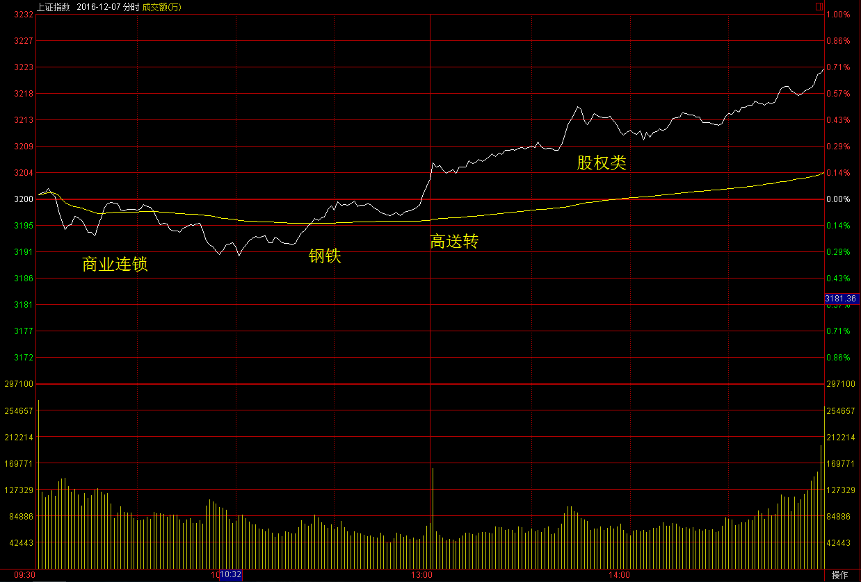 12月7日周三两市平开后震荡上行,尾盘加速上涨。早盘商业连锁、钢铁、重组股活跃,下午高送转,次新股,股权类涨幅居前。阿里入股的三江购物(601116)继续连板,和封板的步步高(002251)带动商业连锁大幅上涨,激发资金热情,市场对低位的商业股有价值重估预期。高送转龙头易事特(300376)七天六板继续维持板块热度。钢铁龙头大冶特钢(000708)带动钢铁上涨。