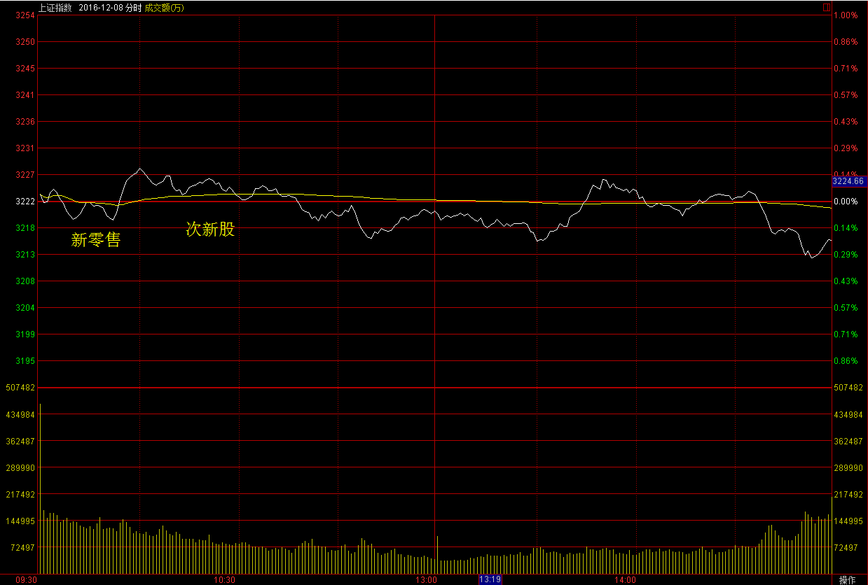 12月8日周四两市早开后沪指弱势横盘,创业板单边下行,尾盘快速跳水。早盘零售、次新股、股权类活跃,下午以前期强势股超跌反弹为主。泛股权概念的三江购物(601116)、英力特(000635)、双塔食品(002481)、贵绳股份(600992)封板。新零售概念继续是三江购物和步步高(002251)独舞。