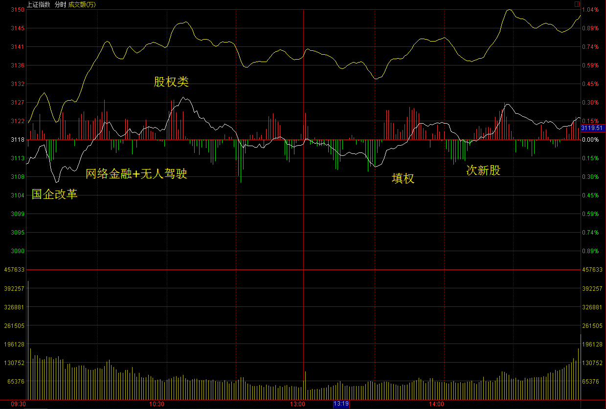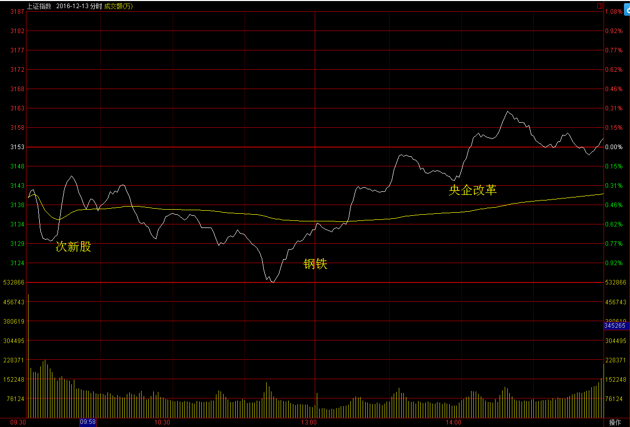 12月13日周二两市低开后探底回升。早盘次新股、军工、农业股活跃,午后次新股、钢铁、央企改革、石油、水泥概念涨幅居前。收盘沪指上涨0.07%,创业板上涨0.03%。股权转让个股银鸽投资(600069)第二板。带动武昌鱼(600275)、同洲电子(002052)、贵绳股份(600992)等涨停。钢铁概念三钢闽光(002110)带动钢铁有好的表现。军工在钢构工程(600072)打板下整体表现强势。