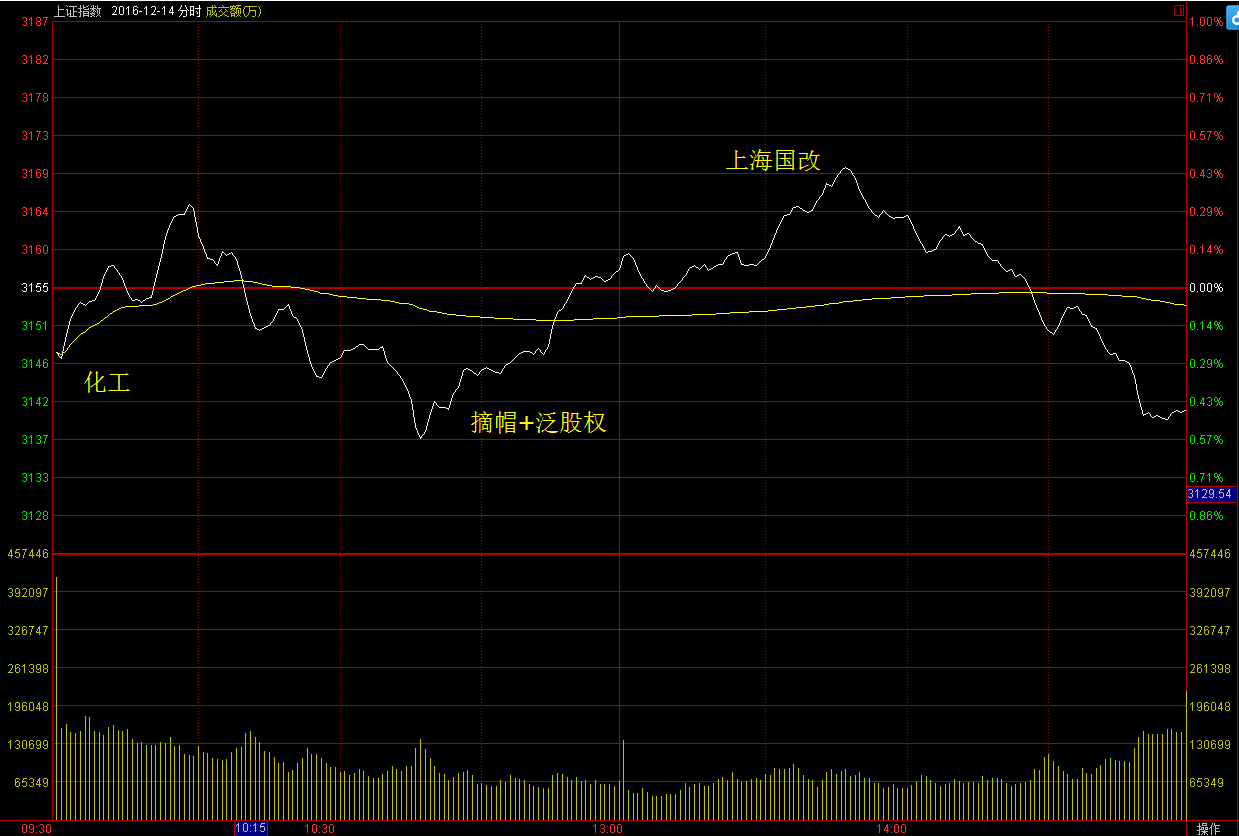 12月14日周三两市低开后震荡下行。早盘泛股权、化工,摘帽、新零售、高送转概念活跃,午后军工、国改,黄金股活跃。收盘沪指下跌0.46%,创业板下跌1.11%。金牛化工(600722)、银鸽投资(600069)、三钢闽光(002110)、冀凯股份(002691)均连板。股权类在银鸽投资带领下表现抢眼。上海国改在上海凤凰(600679)带领下多只个股封板。化工股多只品种具有涨价逻辑,在金牛化工带领下表现活跃。